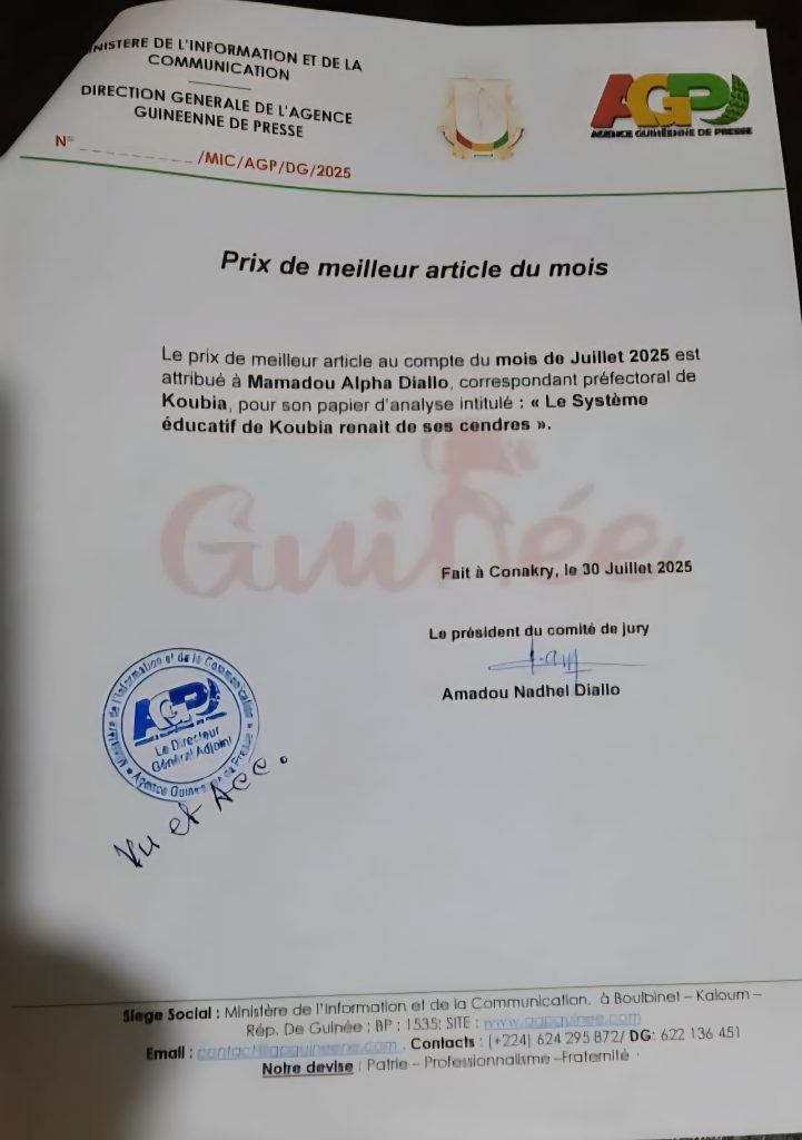 Conakry, 5 août (Infosbruts.com) – Le journaliste Alpha Koubia vient d’être distingué par l’Agence Guinéenne de Presse (AGP), décrochant le prix du meilleur article du mois de juillet 2025. Une consécration obtenue grâce à son reportage percutant intitulé « Le système éducatif de Koubia renaît de ses cendres », qui a séduit le jury tant par la qualité de l’écriture que par la pertinence du sujet abordé.