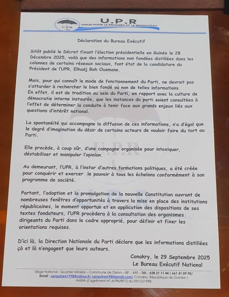 Conakry, 29 septembre (Infosbruts.com) – Alors que le décret présidentiel fixant la date de l’élection présidentielle au 28 décembre 2025 vient à peine d’être rendu public, l’Union pour le Progrès et le Renouveau (UPR) réagit à la rumeur selon laquelle son président, Elhadj Bah Ousmane, serait déjà candidat à cette élection.