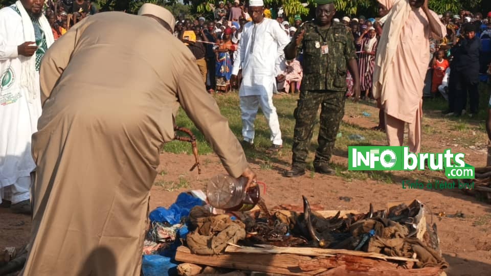 Avant de procéder à l’incinération des fétiches, le guide religieux a adressé un dernier message aux marabouts et féticheurs : « Les hommes et les djinns que vous adorez n’ont aucune force. Seul Dieu est la force. Celui qui me cherche pour me faire du mal, qu’il vienne avant ma mort. Sinon, qu’il sache que ses fétiches ne valent rien. »