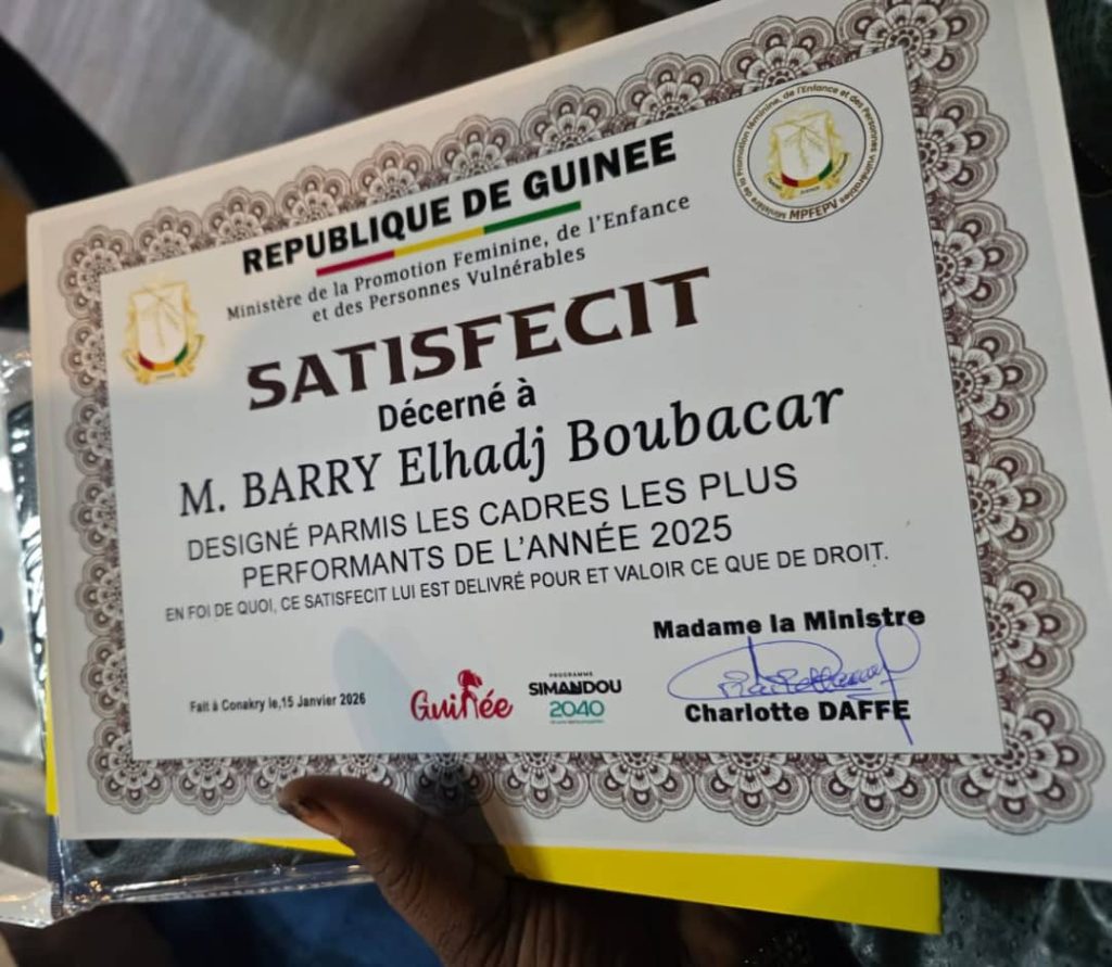 Koubia, 26 janv. (Infosbruts.com) – Un cadre de la Direction préfectorale de la Promotion féminine, de l’Enfance et des Personnes vulnérables (DPFEPV) de Koubia a été honoré par un satisfécit à caractère honorifique. Il s’agit d’Elhadj Boubacar Barry, chef de la section Enfance, distingué pour ses performances remarquables au titre de l’année 2025, et classé parmi les cadres les plus méritants du département, bénéficiant ainsi de la confiance de sa ministre de tutelle.
