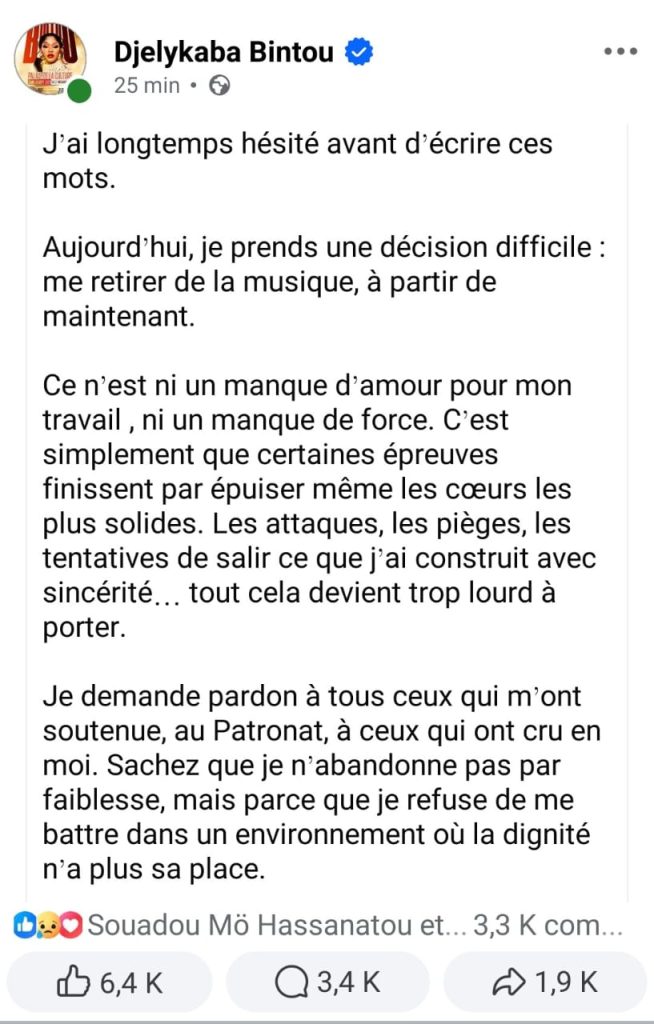 Reste désormais à savoir si cette annonce marque réellement la fin d’un parcours artistique exceptionnel ou s’il s’agit d’un moment de rupture passager, dicté par la pression et l’émotion. Une chose est sûre : dans un paysage musical guinéen où Djelikaba Bintou occupe une place singulière, son éventuel retrait laisserait un vide difficile à combler.
